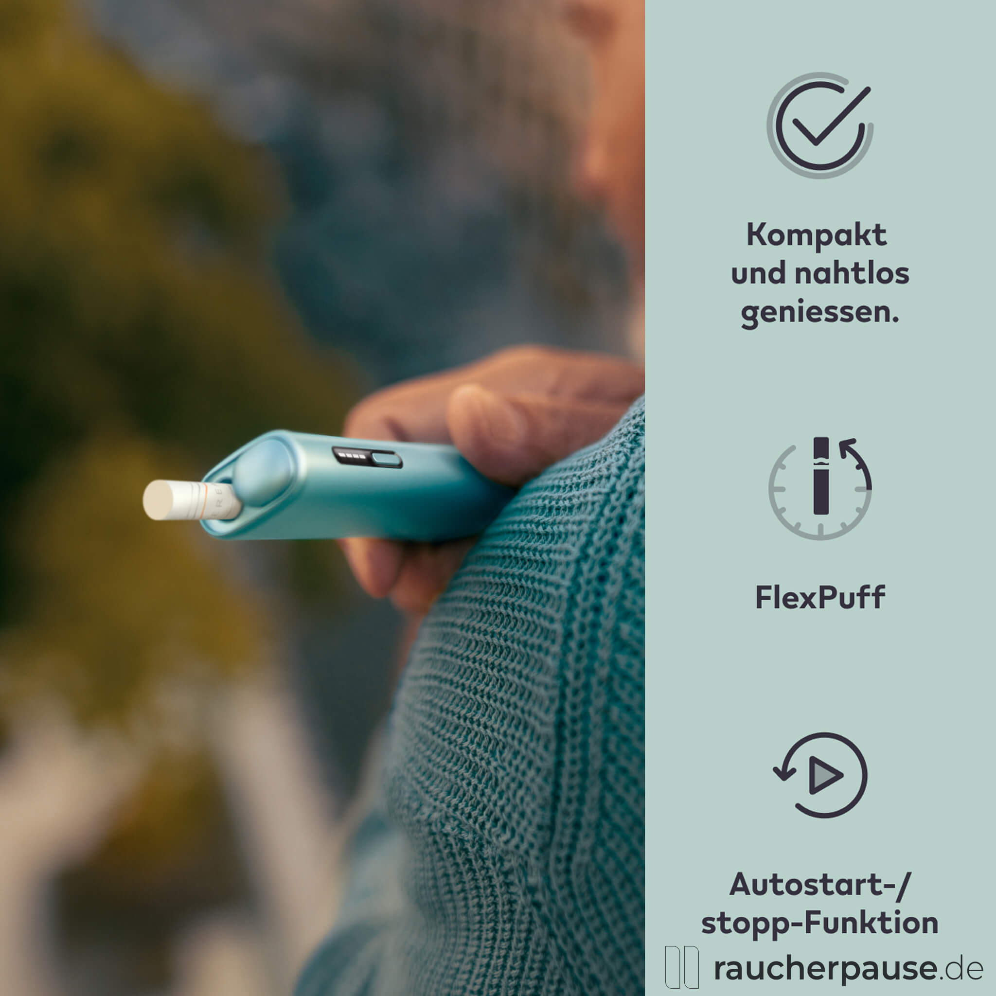 - Innovatives Design: Kompaktes All-in-One-Gerät in stilvollem Breeze Blue für eleganten Tabakgenuss unterwegs.