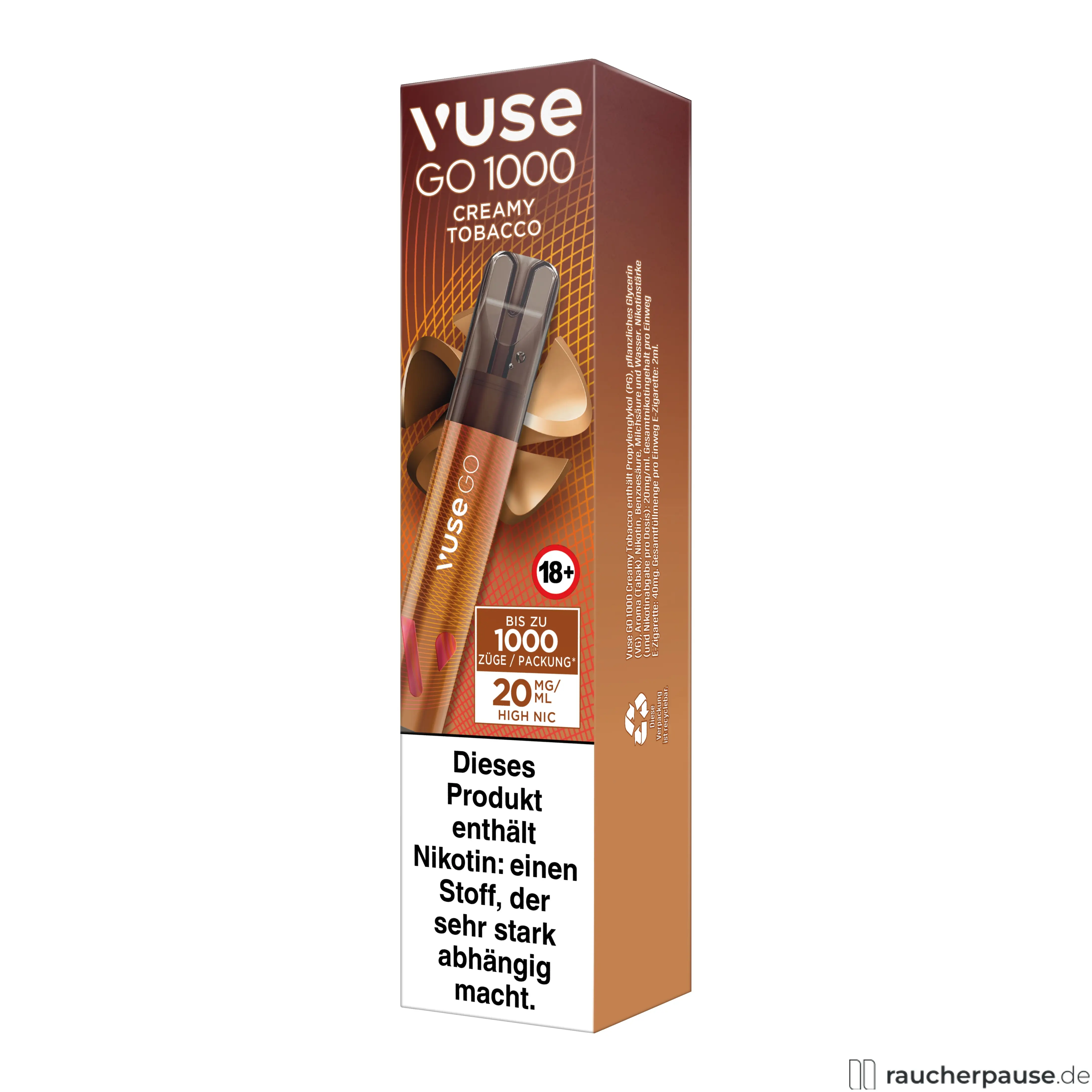 Die Vuse GO 1000 Creamy Tobacco Einweg E-Zigarette verbindet klassischen Tabakgeschmack mit einer cremigen Note – ein Muss für traditionelle Dampfer mit einem Hang zum weichen Abgang.
