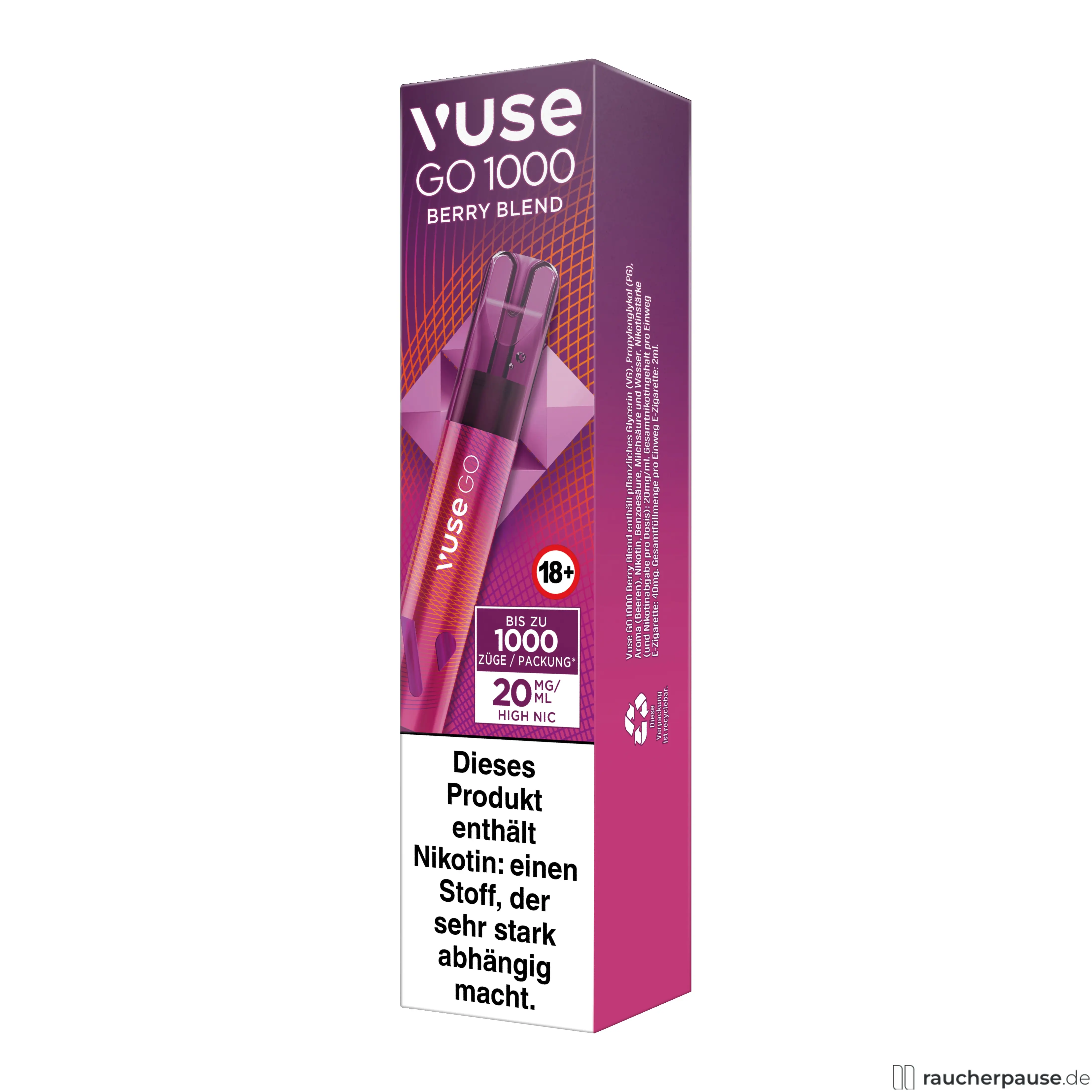 Erleben Sie ein intensives Dampferlebnis mit der Vuse GO 1000 Berry Blend Einweg E-Zigarette. Diese kompakte E-Shisha bietet bis zu 1000 Züge und ist ideal für alle, die ein unkompliziertes und geschmackvolles Vape-Erlebnis suchen.